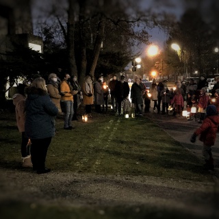 Nach einem Wortgottesdienst, in der die Geschichte von Lucia mit Bildern anschaulich erzählt und vom heute noch in Schweden gelebten Brauch einer mit einem Lichterkranz geschmückten Lucia berichtet wurde, ging auch dieses Mal eine Laternen- und Kerzenprozession rund um die Kirche bis zur Christophorusstatue.