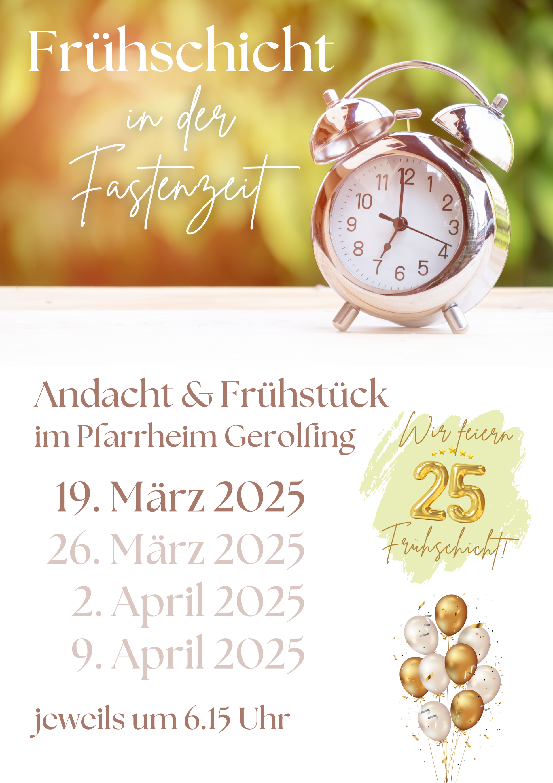 Wir laden herzlich ein zur Frühschicht in der Fastenzeit am 19. März 2025 um 6:15 Uhr im Pfarrheim Gerolfing.