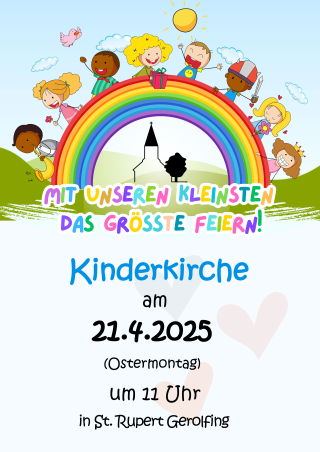habt Ihr Lust, uns in der Kinderkirche zu besuchen? Nehmt Eure Mama, Euren Papa, Eure Geschwister oder Eure Oma, Euren Opa mit und schaut doch einfach mal vorbei! Wir freuen uns auf Euch!