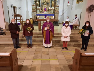 Pfarrer Bucher ehrt Lektorinnen, Kommunionhelferin, Büchereileiterin und Pfarrbrief-Austräger