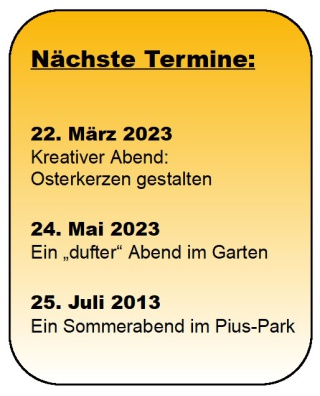 Wir treffen uns jeden 2. Mittwoch im Monat nach der Abendmesse im Pfarrheim St. Christoph / Friedrichshofen.