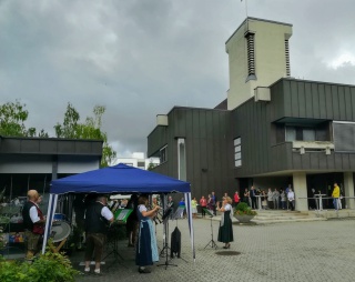 Viele Gemeindemitglieder blieben noch zum anschließenden Sektempfang im Pfarrhof, der von den Blechbläsern St. Christoph mit einem musikalischen Abschiedsgruß begleitet wurde.