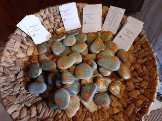 Nach den Gottesdiensten wurde als Ostergeschenk ein selbstgemalter Stein "Motiv Blume" mit einer Ostergebetskarte "Jesus lebt!" verteilt.