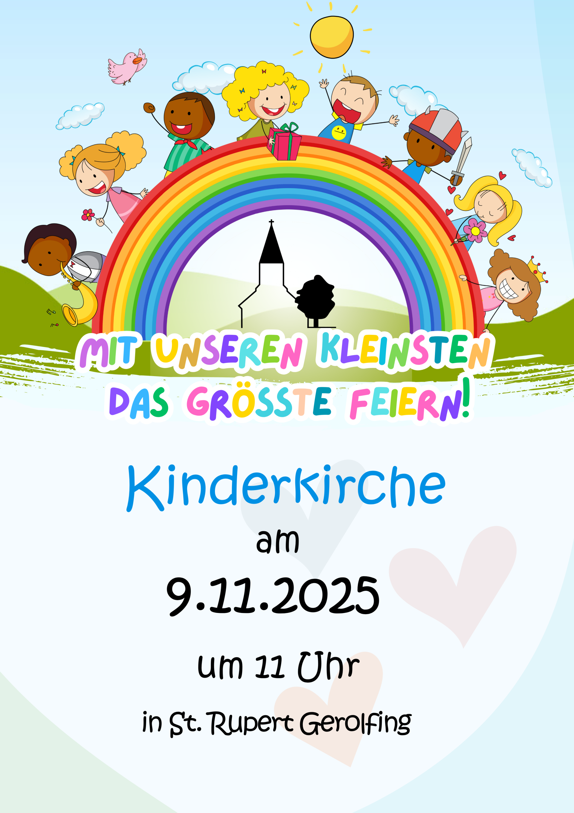 habt Ihr Lust, uns in der Kinderkirche zu besuchen? Nehmt Eure Mama, Euren Papa, Eure Geschwister oder Eure Oma, Euren Opa mit und schaut doch einfach mal vorbei! Wir freuen uns auf Euch!