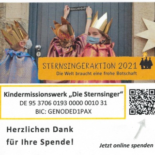 Um den Dreikönigstag nicht einfach so verstreichen zu lassen, setzte sich Martin Liebold mit Pfarrer Bucher in Verbindung. Es erschien sinnvoll sich der Sternsingeraktion des BDKI anzuschließen. So erhielt jeder, der sich in Mühlhausen für die Sternsinger angemeldet hatte, ein Paket mit Kreide, Weihrauch, Kohle, eine Segenskarte, Segensaufkleber und eine Spendentüte mit Spendenkarte.