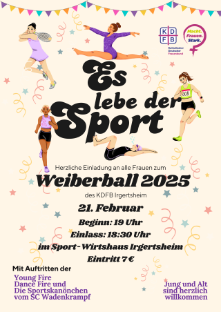 Der Katholische Deutsche Frauenbund (KDFB) Irgertsheim lädt alle Frauen herzlich zum Weiberball 2025 ein. Unter dem Motto „Es lebe der Sport“ erwartet Sie ein geselliger Abend voller Unterhaltung, Musik und mitreißender Showeinlagen.